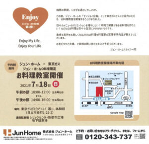 【Enjoy コラボ企画】 ジュン・ホーム 東京ガス お料理教室開催します? 東京ガスさんのご協力のもと、お料理教室を開催します。 キッチンにはなくてはならないコンロ。 ガスの炎で作った温かみのある料理には […]